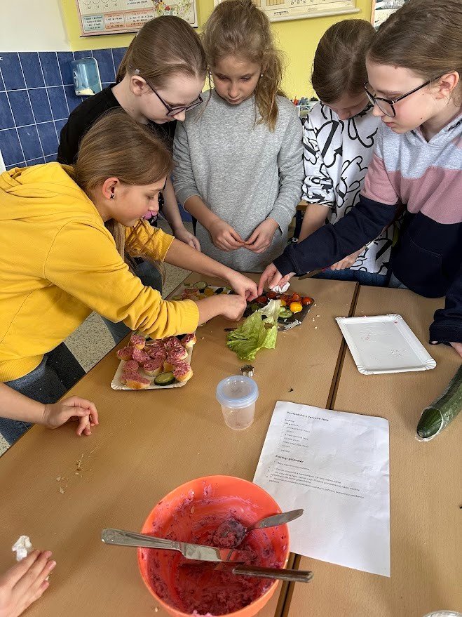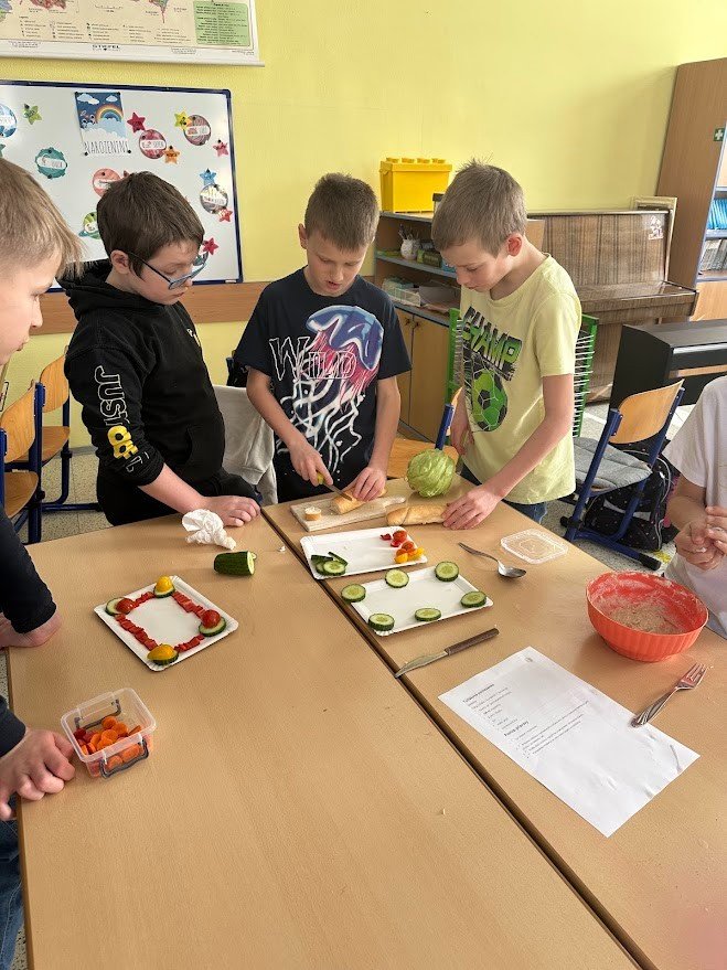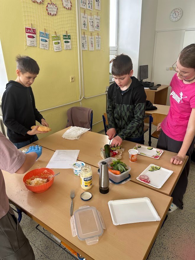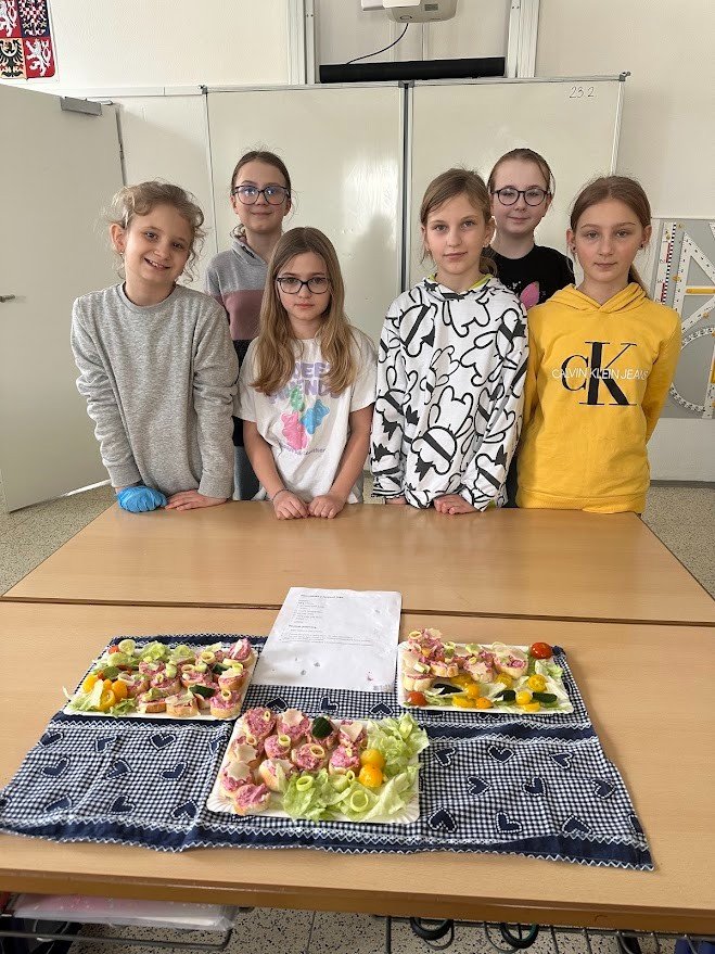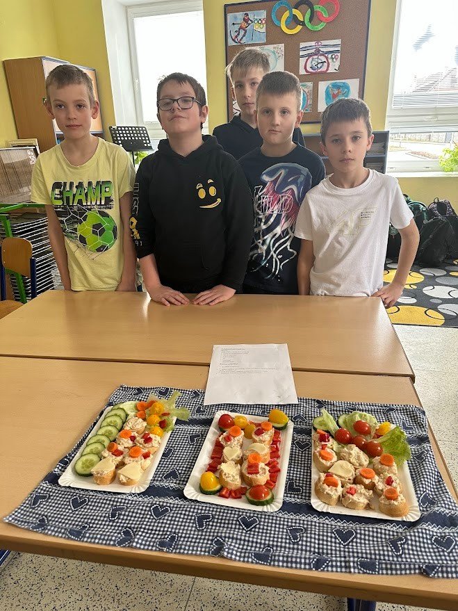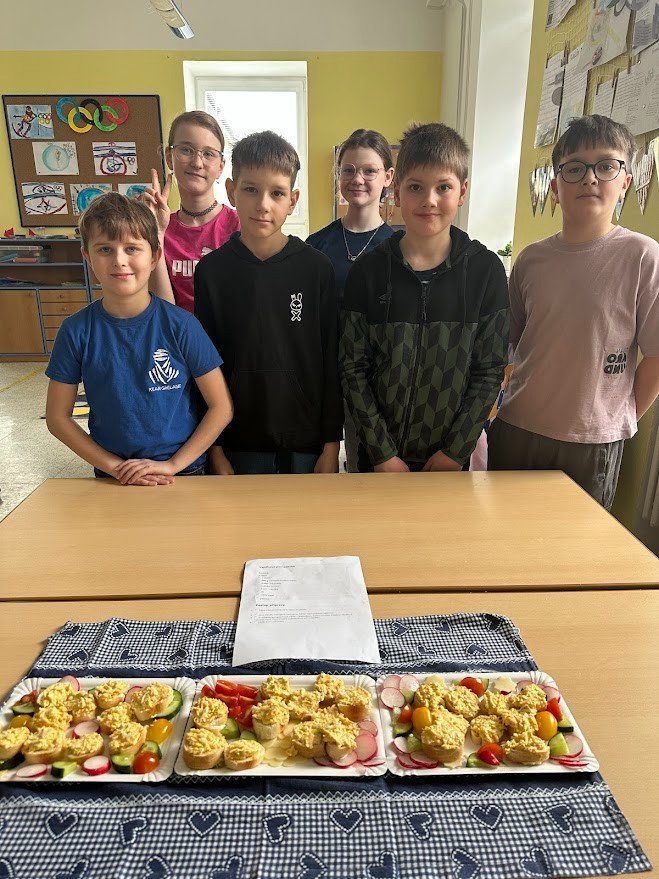 V hodině PČ si čtvrťáci vyzkoušeli ve třech skupinkách vyrobit tři druhy pomazánek, které servírovali jako jednohubky na zeleninovém tácku. Povedlo se!